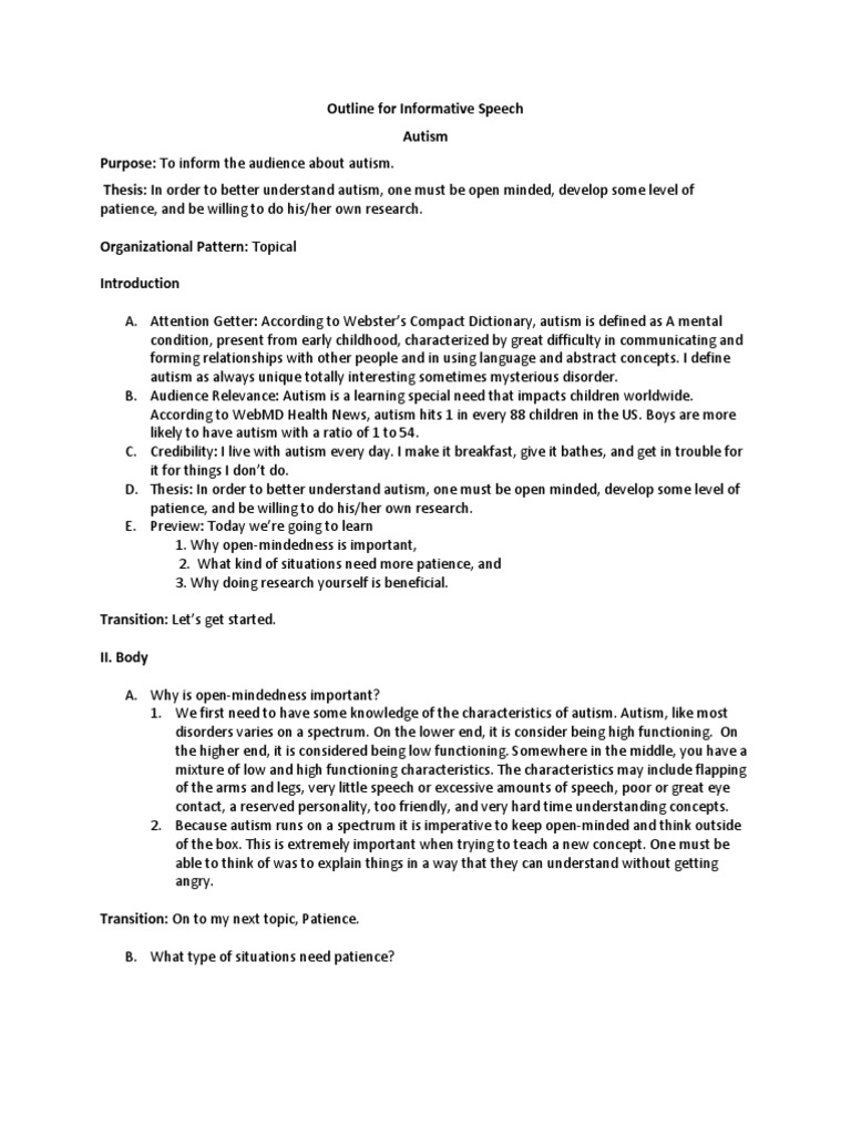 Sample Informative Speech Outline 3 from image.slidesharecdn.com I am a coffee lover and drink coffee throughout the year and have done research on this topic. Also it's very important to concider who your audience will be in order to peak their interests. How is that cup of coffee affecting your brain, thinking skills, alertness, sleep, and overall health? In this section, we discuss the three parts of an informative speech, calling attention to specific elements that can enhance the effectiveness of your speech. Unlike persuasive speeches, an informative speech relies less on pathos and more on communicating information. The outline of your speech should. Providing knowledge, especially useful or interesting information. You want to present facts and important information to your audience, especially when.